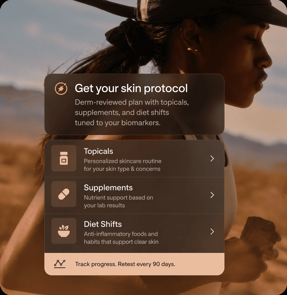 Derm-reviewed plan with topicals, supplements, and diet shifts tuned to your biomarkers.